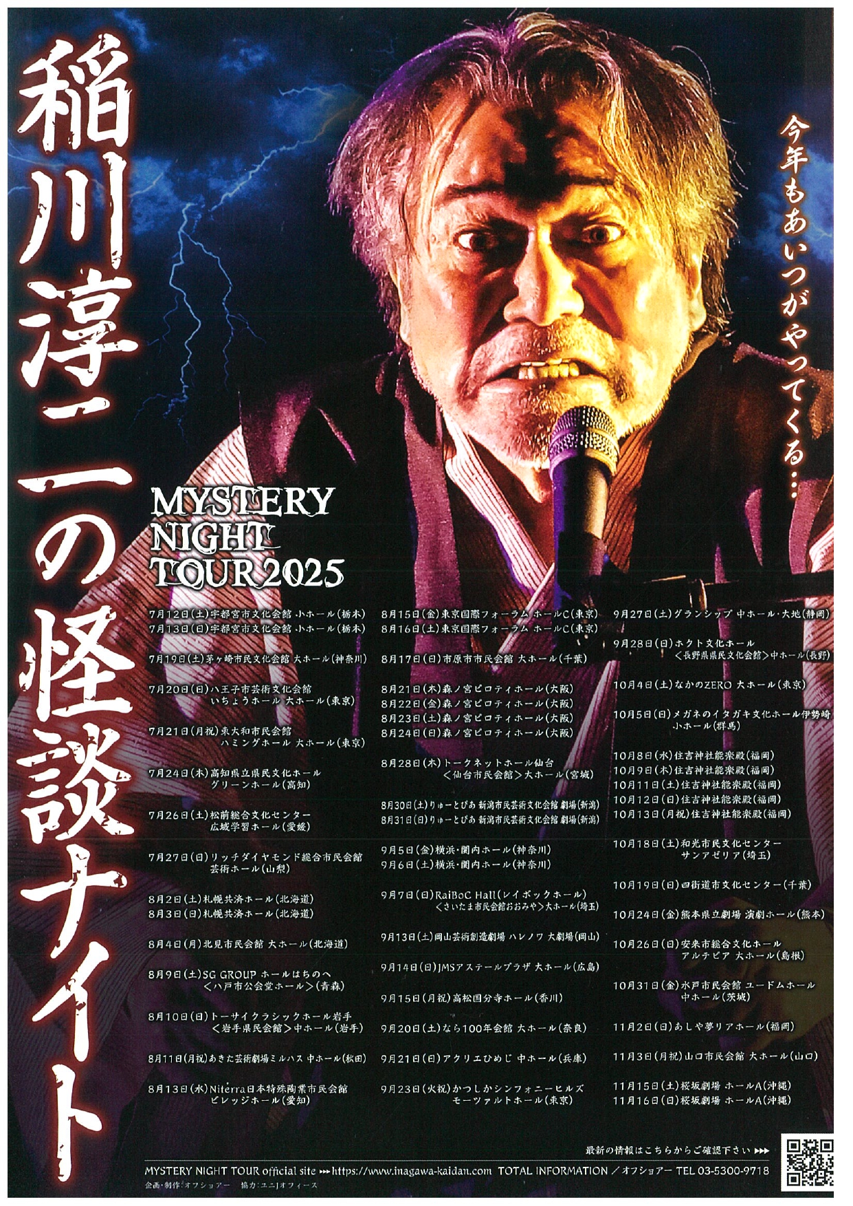 1993年から始まり、ひと夏も立ち止まることなく33年間連続公演となる夏の風物詩「怪談ナイト」。恐怖と感動の伝道師・稲川淳二が織りなす唯一無二の怪談の世界をご堪能ください。